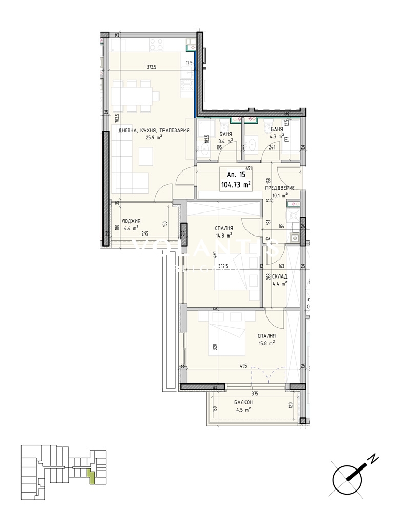 2524   3-стаен апартамент   Сз, Юз   3   А 22   122.89 кв. м.   104.73 кв. м.   Продаден